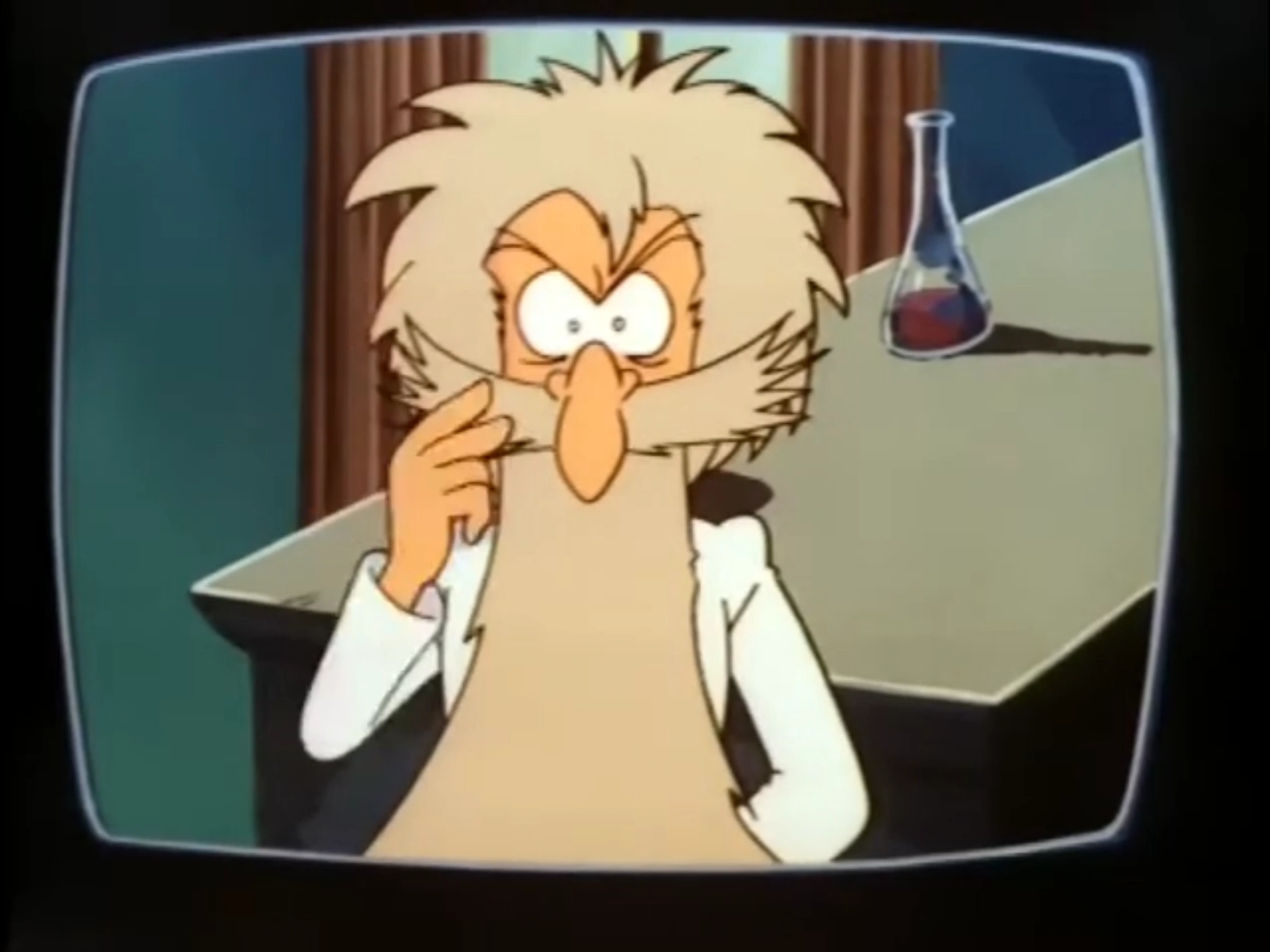 Doomkauf is a middle-aged man with wild white hair, matching long beard and a long nose. He wears a green turtleneck under a white lab coat, red trousers and black shoes.