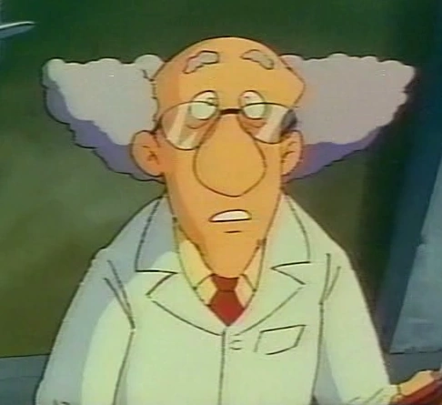 Flugelmeyer is a middle-aged man with goofy white hair. He wears a cream shirt and red tie under a white surgical coat, blue trousers and brown shoes.