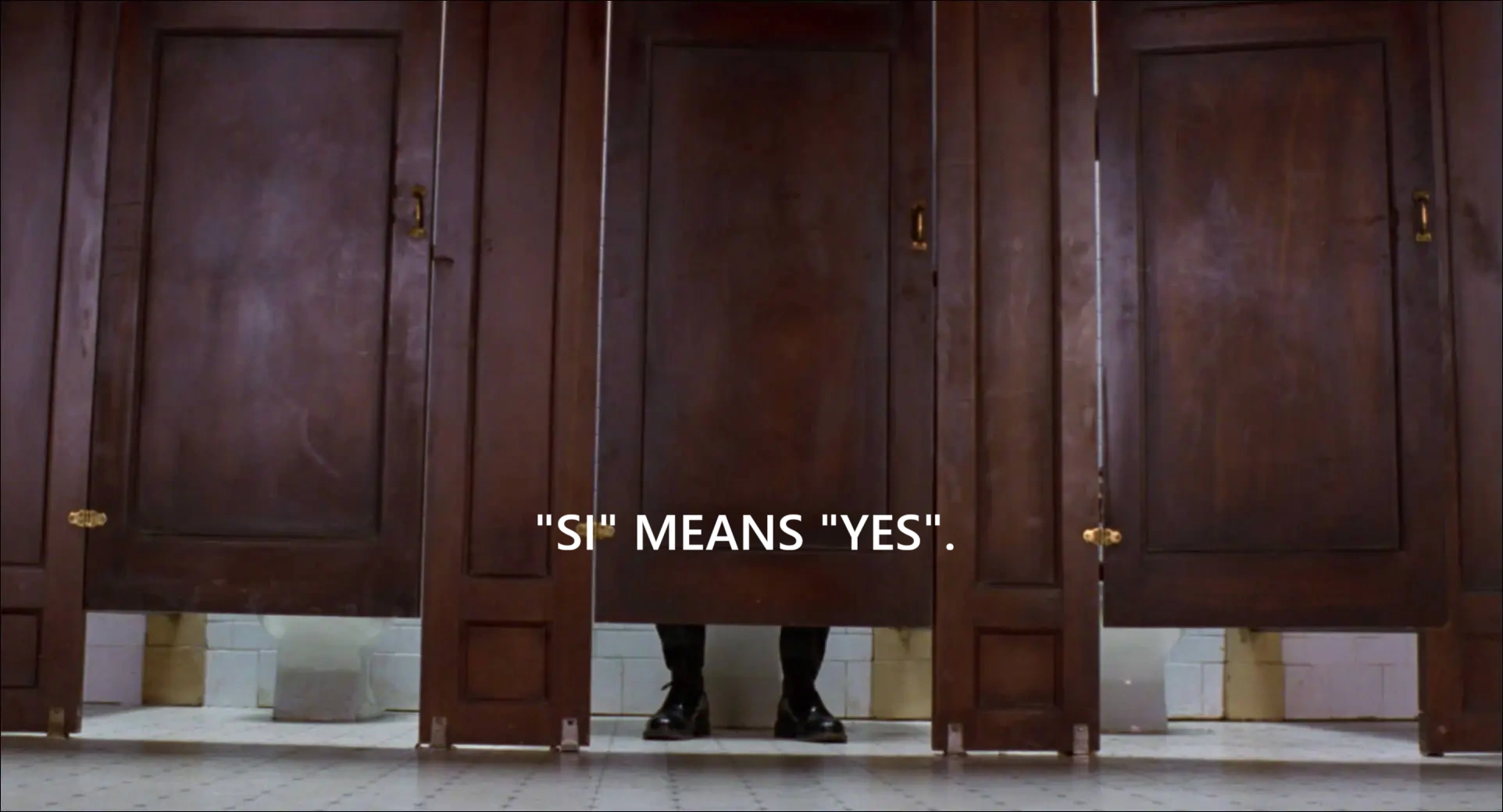 While searching through the Bradford murder file in a toilet cubicle, Gadget finds a small round piece of metal. Using his Gadget Magnifying Glass, he finds the letters "S.I." printed on it. Activating his Gadget Spanish Translation gadget, the computerised voice says "Si means yes", much to Gadget's surprise.