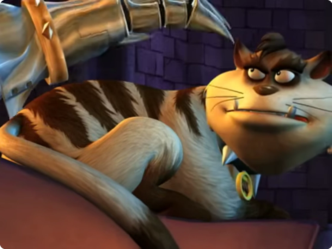 While Dr. Claw is fond and caring towards his pet, he can also be quite abusive with him and bullies M.A.D. Cat when the latter annoys him or in a fit of anger due to his schemes being foiled. Despite this, M.A.D. Cat always forgives Claw (usually by the next scene), and whenever Claw makes his getaway he never leaves M.A.D. Cat behind. This is most notably shown in Quimby Exchange when he became frozen to Claw’s desk forcing him to tear the frozen cat off as he left.