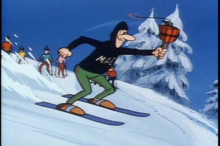 The M.A.D. Torchbearer is a dangerous man due to the dynamite torch he was carrying while skiing toward the Olympic flame.