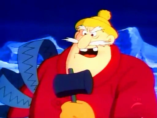 A short while later, Gadget had become snowblind. Claw contacted the Trapper again and told him to eliminate him. The Trapper replied it would be simple since Gadget was now in avalanche territory. Blowing on a large horn to emulate a moose call, the Trapper was sure things would start rolling soon. But Gadget mistook him for a thirsty moose and shot his water pistol finger straight at the Trapper's face, causing a block of ice fo form around his entire head. Having indeed caused an avalanche, the Trapper walked off a cliff and slid down an ice slide. On his way down he was joined by the dog sized reindeer, who ended up sitting on the Trapper's stomach. They ended up inside a cave inhabitted by a polar bear. The reindeer ran off, but the Trapper was carried out by the angry bear. When the polar bear growled loudly in the Trapper's face he blew away what remained of the block of ice and caused another downpooring of snow. They were burried for a moment, but the Trapper managed to escape from the bear.
