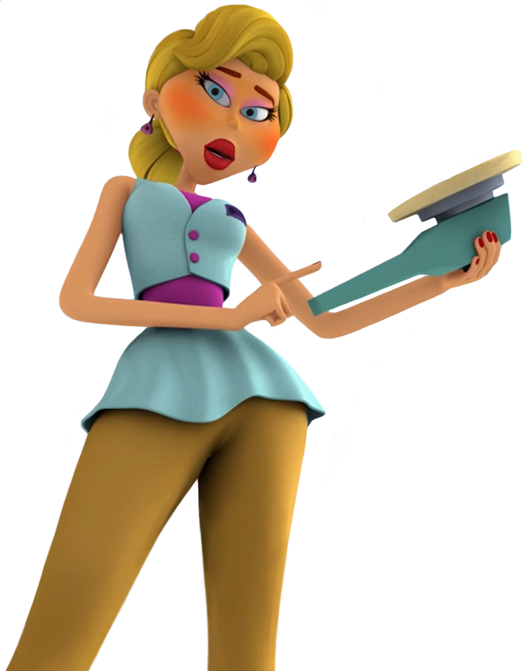 MADalena is a tall slender woman with blond hair, a thin waist and large hips. She has a lot of makeup and pumped lips, wears ocher-coloured pants, pink undershirt and shoes, light blue vest and short skirt.