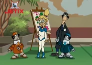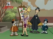 Miss Miffet has the design choice based around any other secretary required to wear work-appropriate clothing, the most notable bit being her all-pink look to match and parallel with her natural yellow blonde. Compared to most employees, she’s small in both height and width - being simple enough to compare even when next to Penny! Even with this description in mind, it’s more often then not we see Miffet giving an exaggerated expression that clashes with the well-put look she tries to give herself.