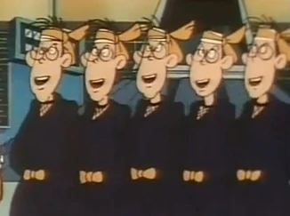 The Samurai Agents (otherwise known as the "Agents of the Great Samurai") are the main subordinates of Iji-Waruda-san. The five Samurai Agents are all identical in appearance: skinny with glasses and several hairs on their heads. They all wear a dark blue ninja costume with Waruda's version of the M.A.D. insignia on the back, black socks and sandals. Each wears an orange and white bandana tied around their heads.